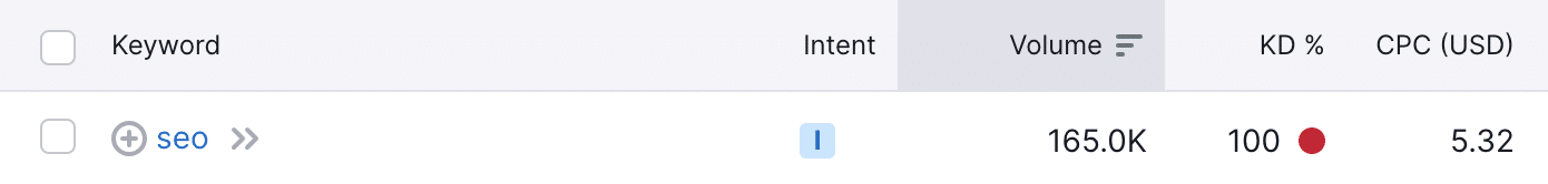 Notice how the search volume for the short tail keyword “SEO” is huge? This may seem enticing, but with a Keyword Difficulty score of 100%, it’s safe to say you won’t be seeing any of that traffic.