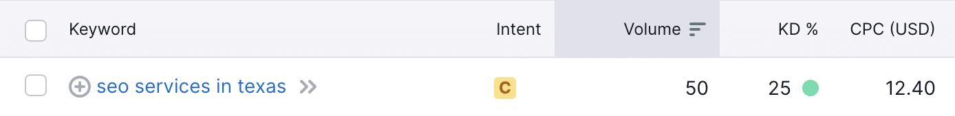 Here, you can see that the long tail keyword “SEO services in Texas” has a much lower Keyword Difficulty score of 25%. This means with the right optimization techniques, you can easily make it to the first page of Google. The only catch is that the search volume is only 50. This is why it’s important to take all factors into consideration when developing your digital content strategy.