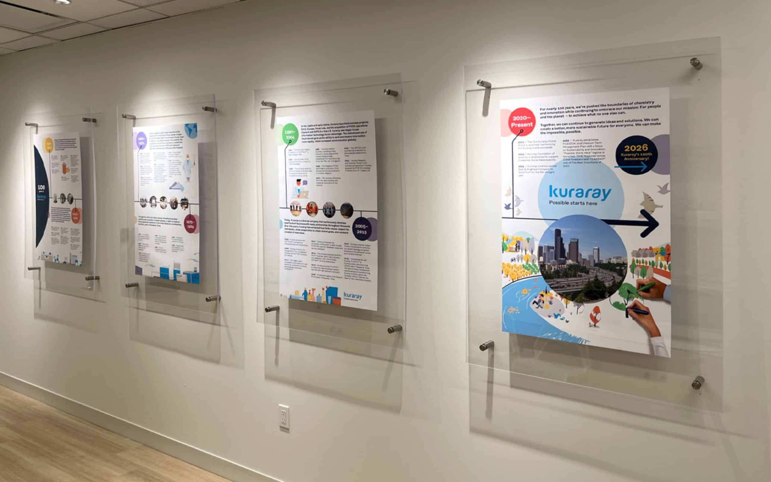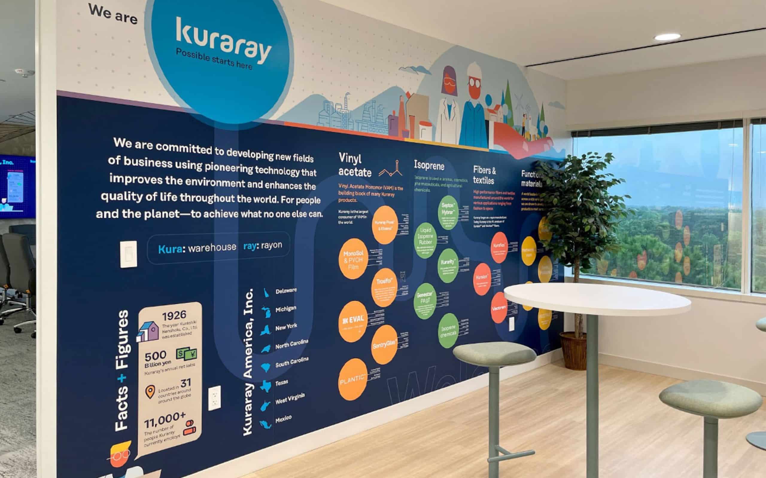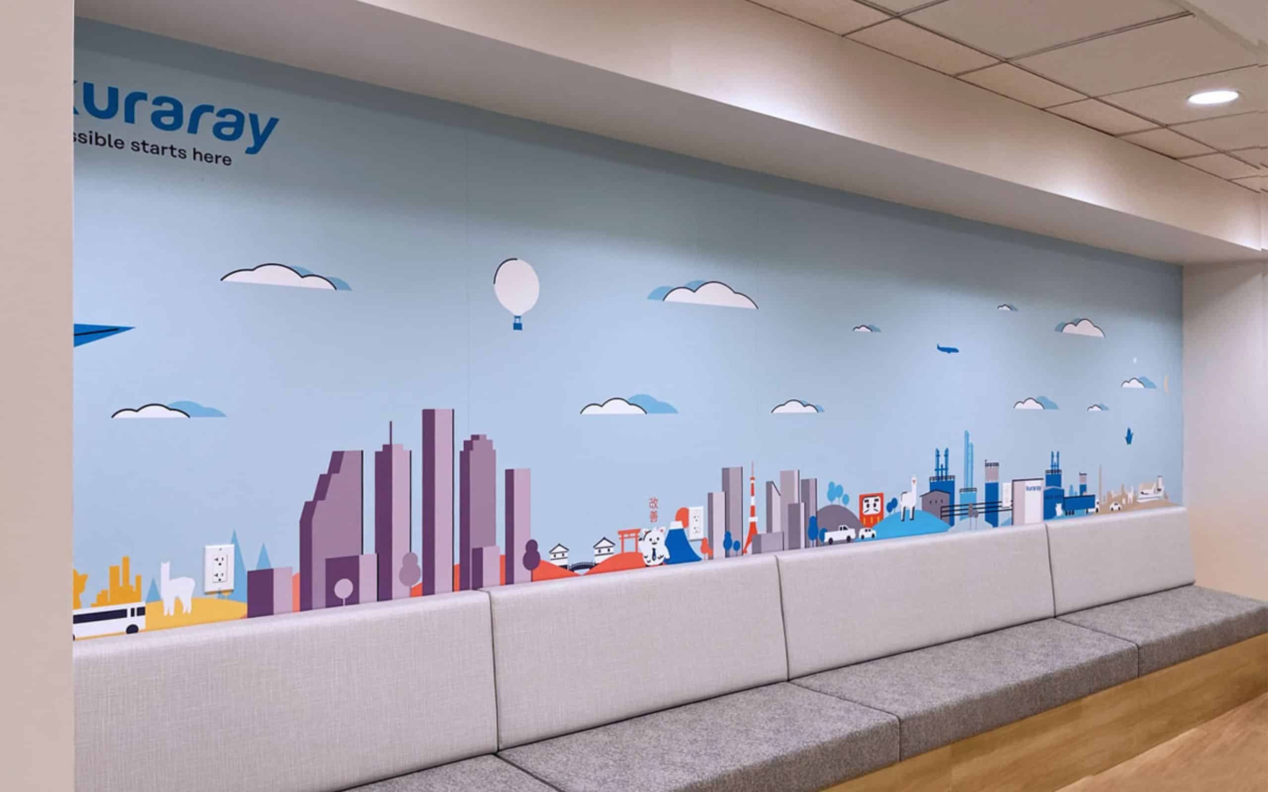 - Office Murals and Wall Signage – We created stunning murals and signage that not only beautify Kuraray’s workspaces but also reinforce their brand identity and mission.
