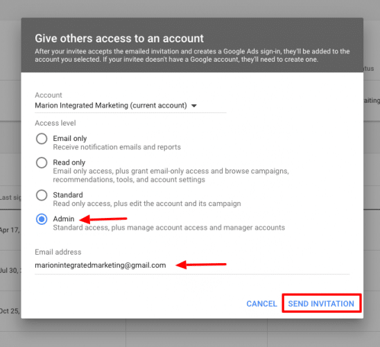 The end user will receive a notification that they have been invited to access your Google Ads account. Once logged into their existing Google Ads account, the invitation can be accepted. At that point, they can manage your Google Ads account.