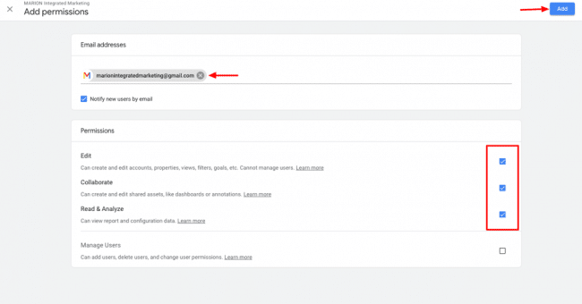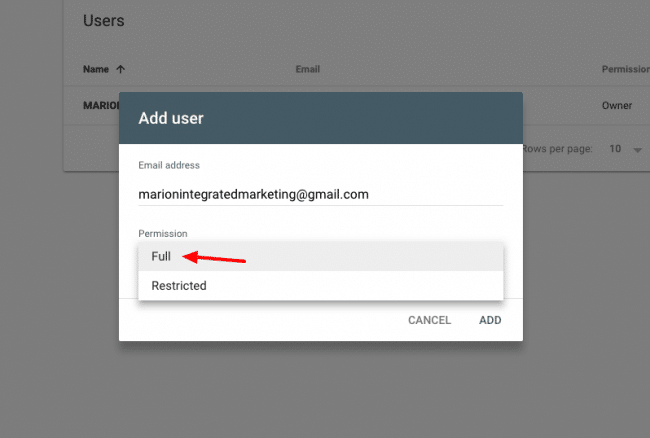 4. Input marionintegratedmarketing@gmail.com (the email address the agency has for access), give Full permission and click ADD
