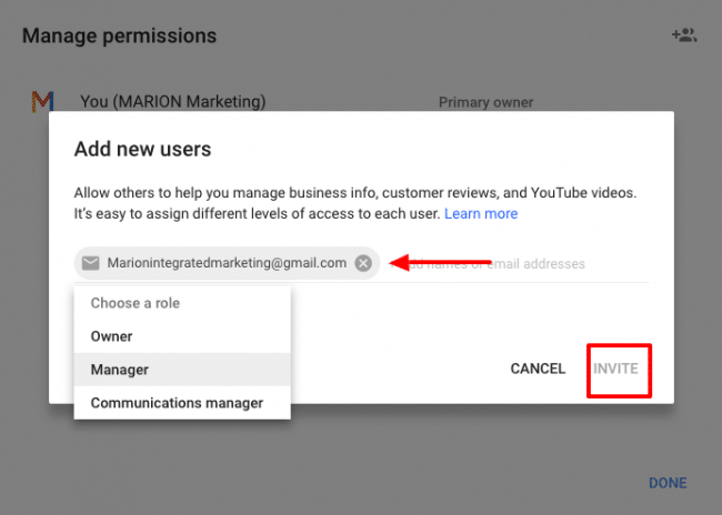 4. Input “marionintegratedmarketing@gmail.com” and choose the role of “Manager.”