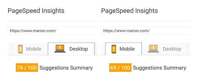 The MARION website scores 74/100 for our desktop version and 69/100 for our mobile version.