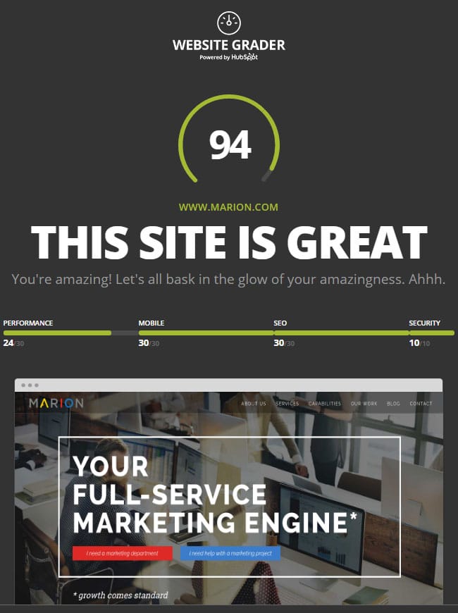 The MARION website scores well on Security, Mobile, and SEO, but only gets 24 of 30 points for performance. Let’s look at the different categories and explore why we got the scores that we did.