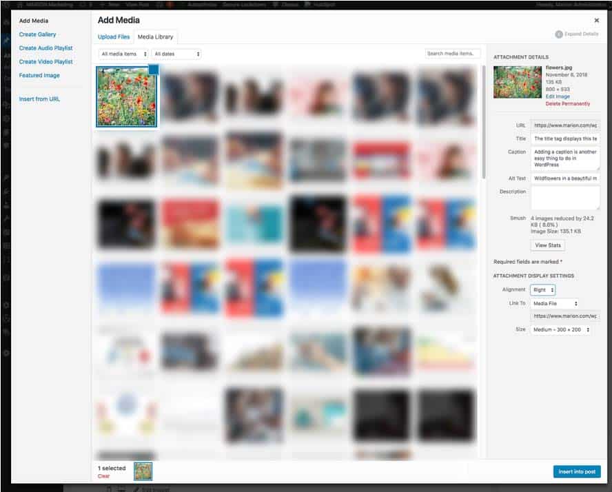 - Once the image has finished uploading, the media library will open. On the right are the options you need to display your image.