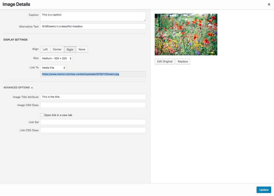 - Caption: If you would like to caption the image, WordPress will display the caption text according to caption display styles from your WordPress theme.