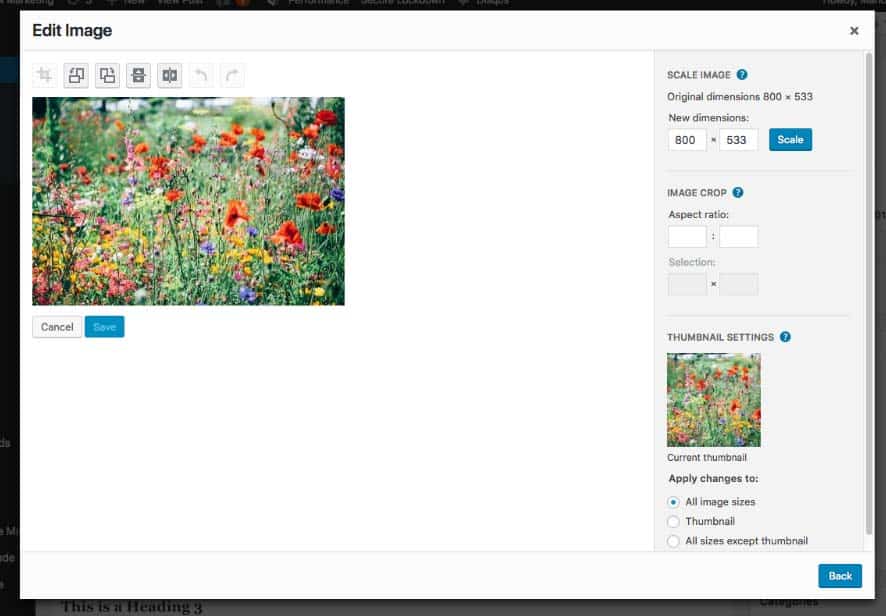 - Choose the appropriate dimension. When you upload, WordPress automatically creates a group of images in descending widths and heights from full size to thumbnail. Therefore, you may not need to upload the exact image dimensions you want to see in your article, freeing you from having to do that with software before publishing. This image group is also used by WordPress to display images responsively, i.e., scaled for the screen width of your reader.